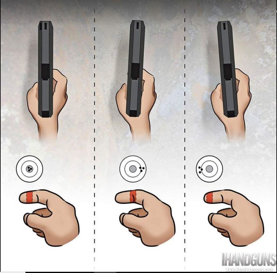 From the graphic above, you can see how the placement of your trigger finger effects the placement of the bullet on the target. The slightest adjustments can have less desirable results.