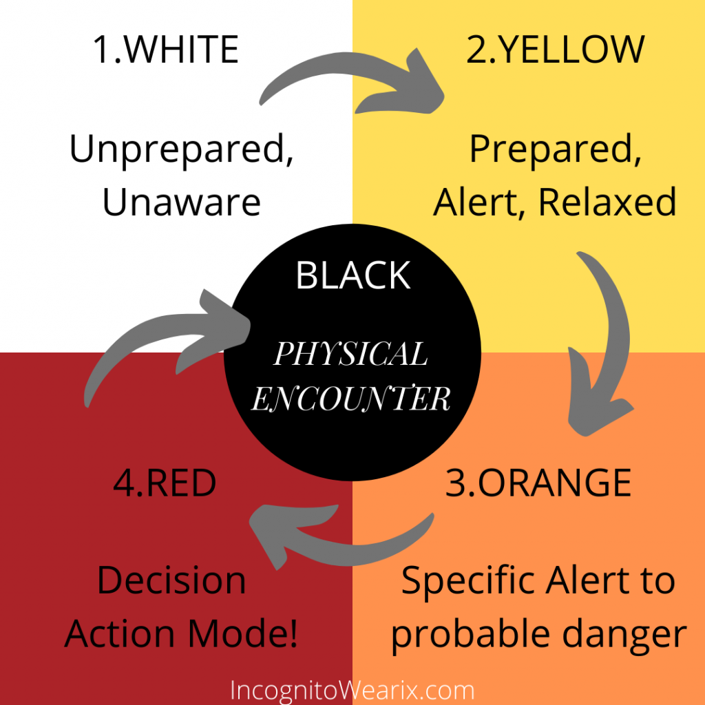 Highly recommended, especially when you’re in a new town, to practice Cooper’s color codes of situational awareness. What are color codes?