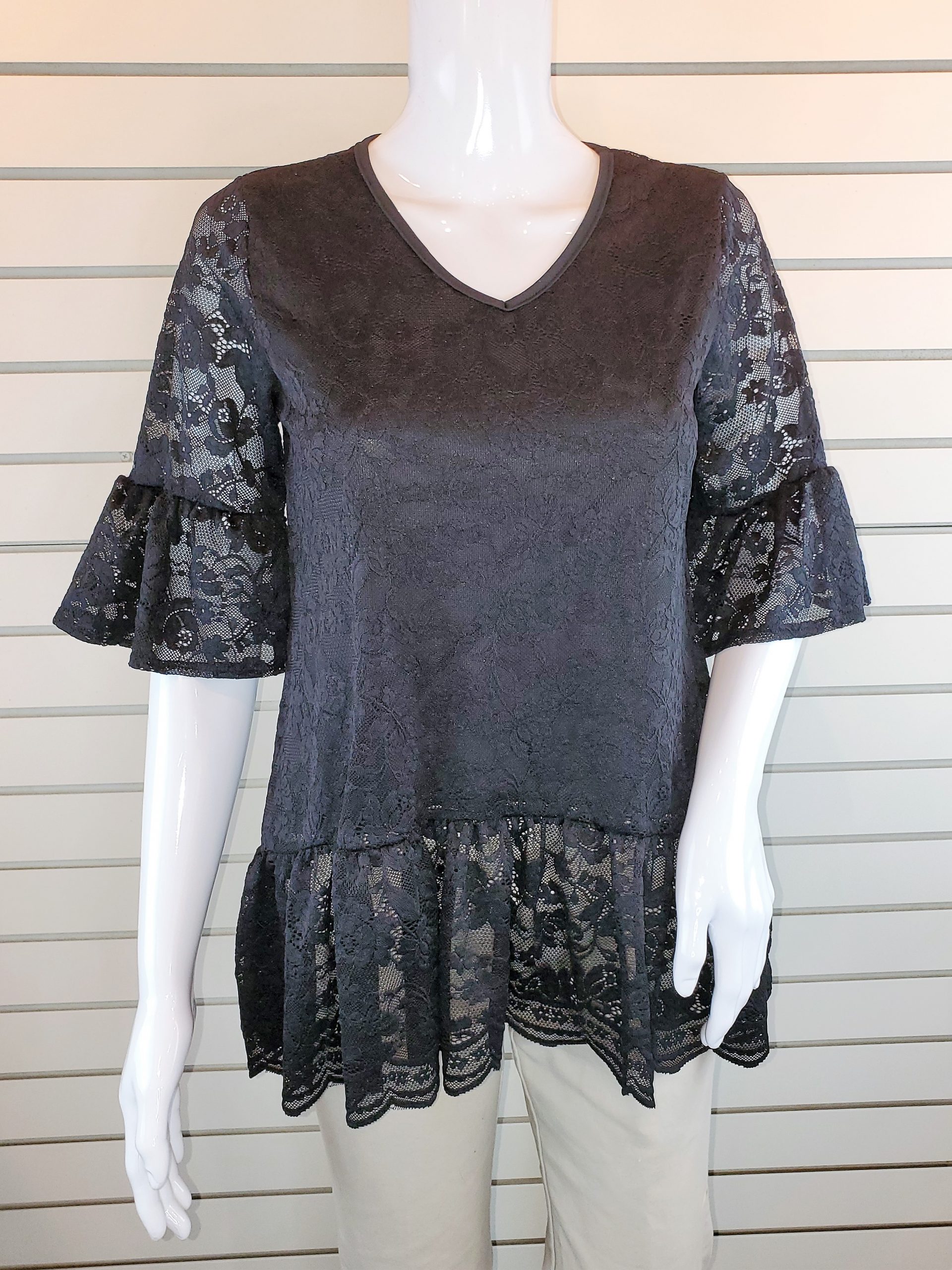 This short sleeve top is Pretty and feminine. With it’s See-through lace with a beautiful ruffle on it’s sleeves and lower hem. But don’t worry, the built in tank top keeps everything else hidden.