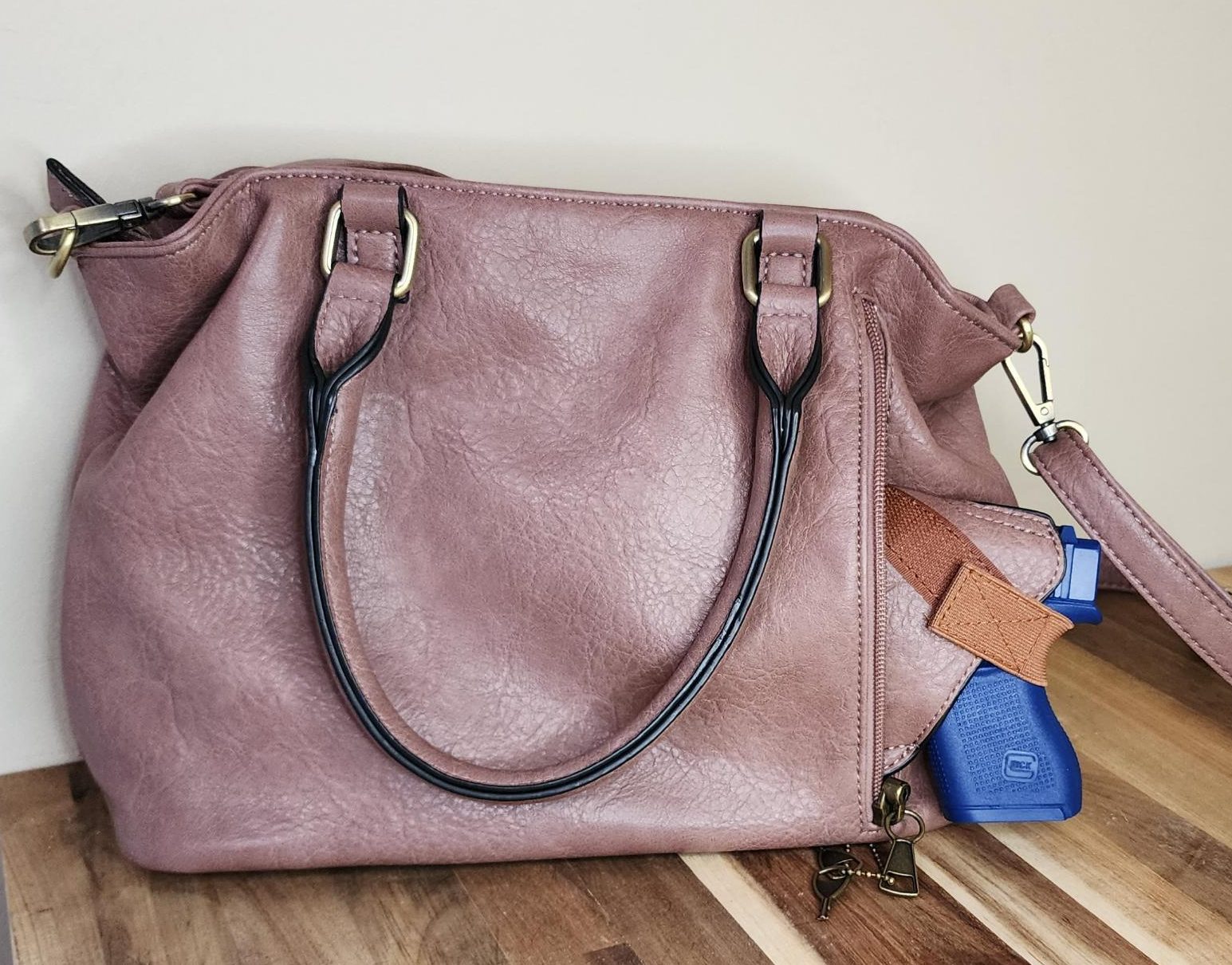 Beautiful dusty pink (or mauve) vegan leather concealed carry purse.