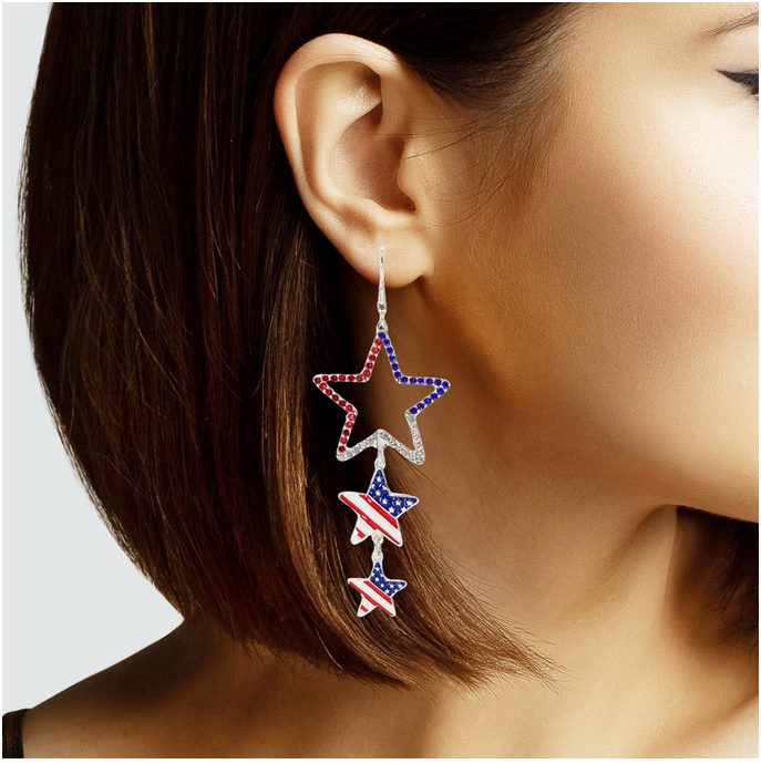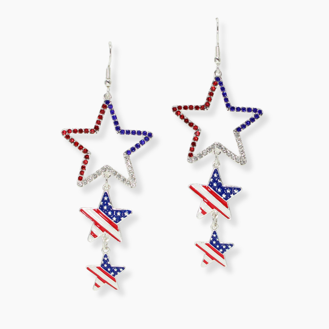 Love the USA! Love these 3 tier dangled rhinestone stars in Red, White and Blue.
