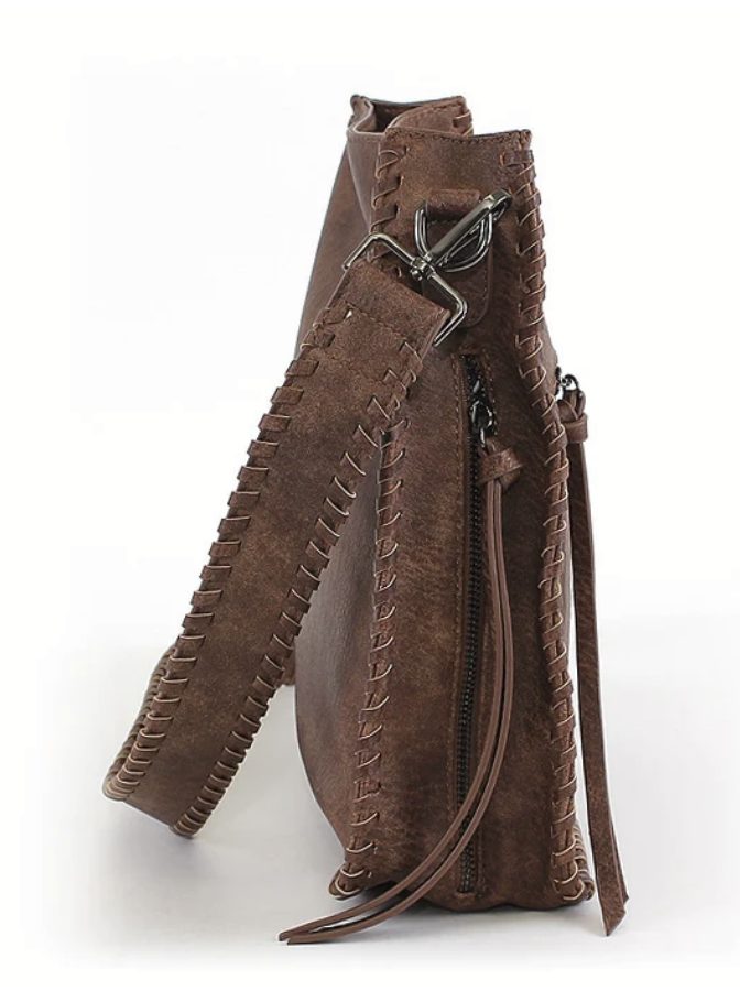 Cross-body messenger with guitar strap. Whip-stitch detail on guitar strap and purse edges. Outside zippered pocket on each side with vegan tassel.