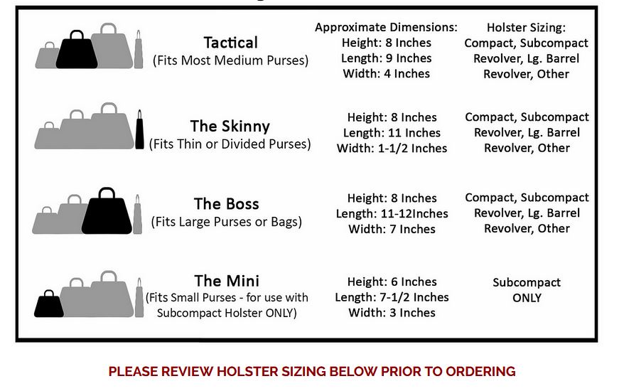 Boss Size for larger bags and totes (approximately 30% larger organizer than Tactical, but with the same holster area) designed for those with larger purses.