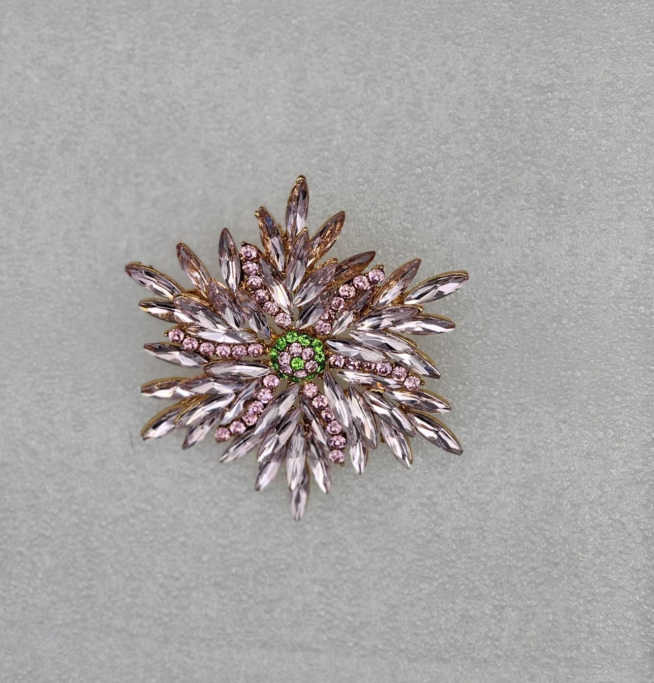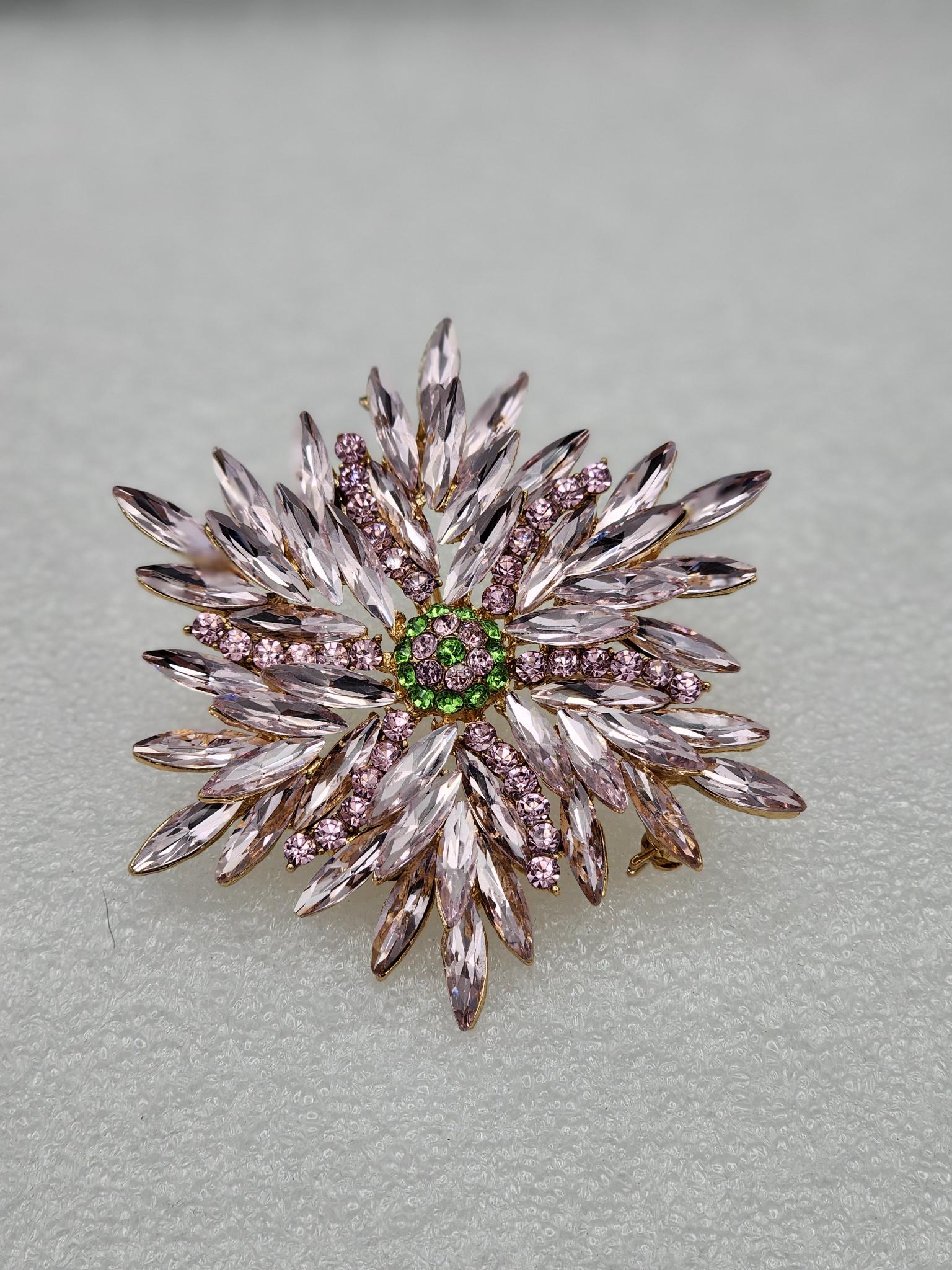 Add a touch of vintage elegance to any outfit with this breathtaking rose crystal floral brooch. Measuring a generous 3 inches across, this eye-catching pin features long, petal-like crystals arranged in a beautiful flower or snowflake pattern that radiates sophistication and sparkle.